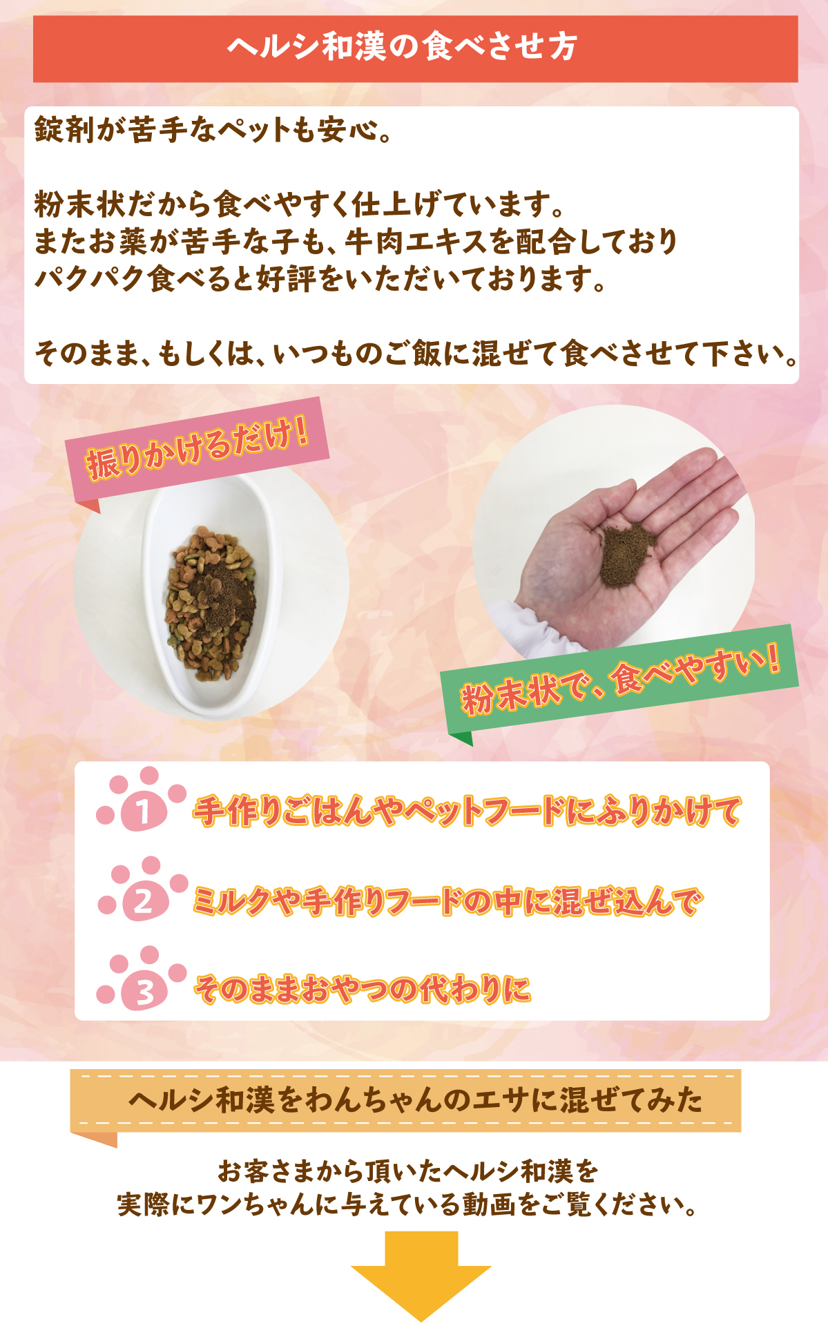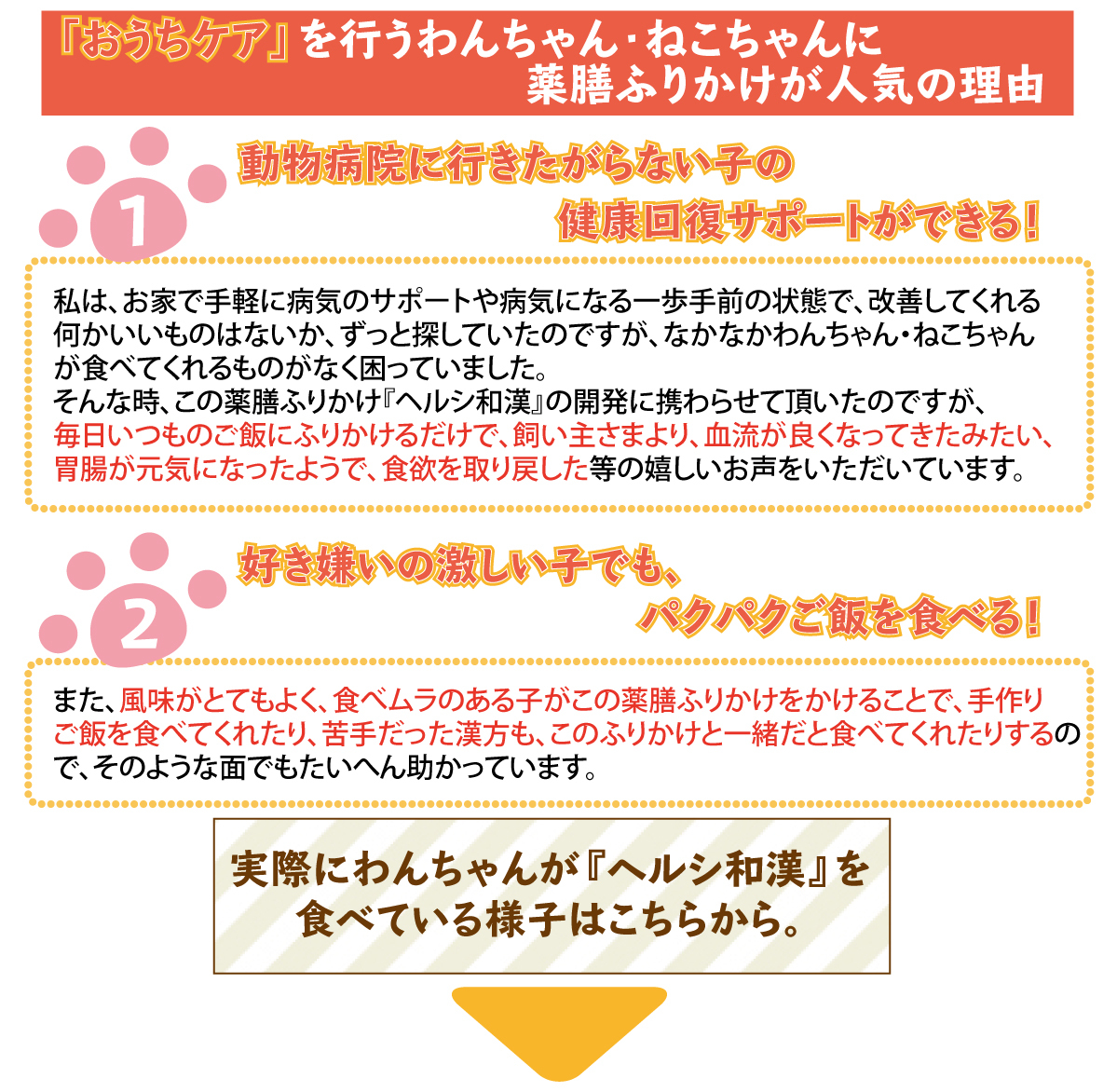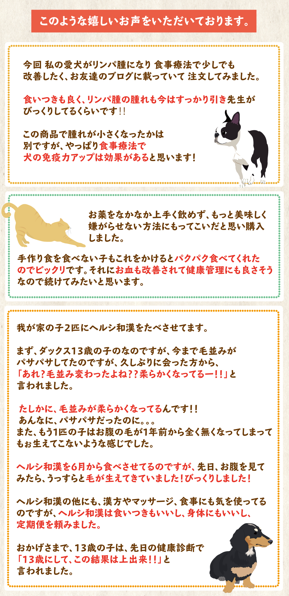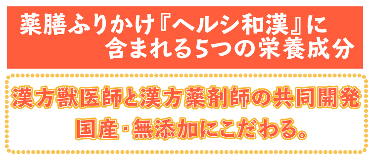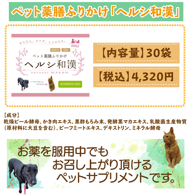 そんな時、この薬膳ふりかけ「ヘルシ和漢」の開発に携わらせて頂いたのですが、毎日いつものご飯にふりかけるだけで、飼い主様より、血流が良くなってきたみたい、胃腸が元気になったようで、食欲を取り戻した等の嬉しいお声を頂いています。