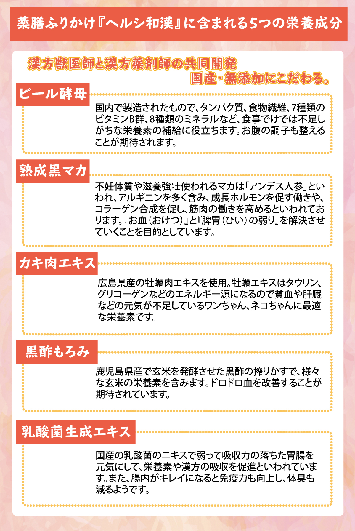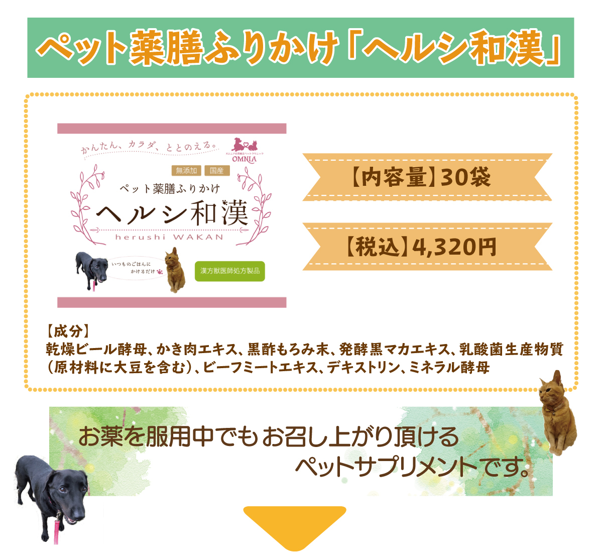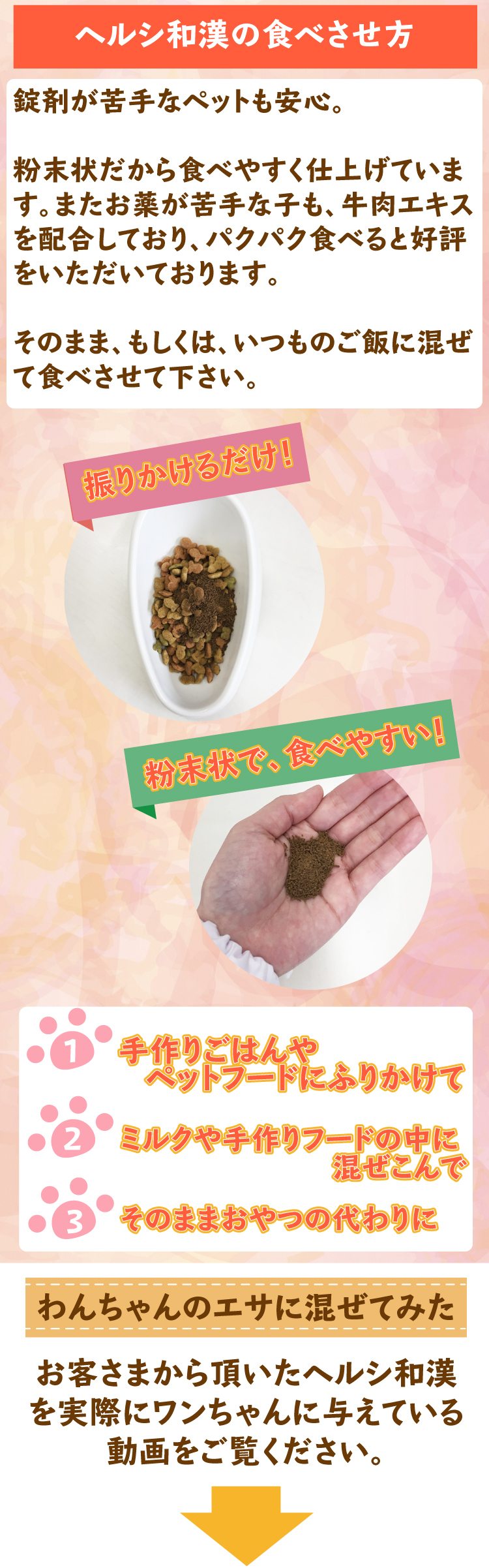 そんな時、この薬膳ふりかけ「ヘルシ和漢」の開発に携わらせて頂いたのですが、毎日いつものご飯にふりかけるだけで、飼い主様より、血流が良くなってきたみたい、胃腸が元気になったようで、食欲を取り戻した等の嬉しいお声を頂いています。