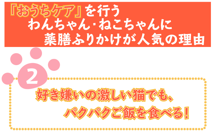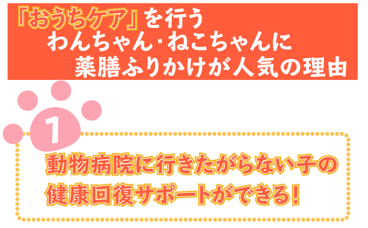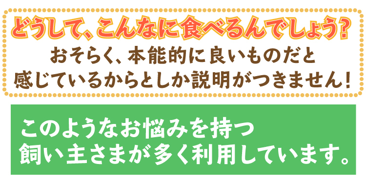 私は、お家で手軽のできる病気の改善や、病気になる一歩手前の状態で改善してくれる何かいいものはないか、ずっと探していたのですが、なかなかワンちゃんやネコちゃんが食べてくれるものがなく、困っていました。